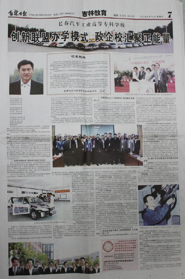 2008年以来,长春汽车工业高等专科学校积极创新办学模式,实现了政府、企业和学校三方力量汇聚,以合作办学、合作育人、合作就业、合作发展为主线,瞄准汽车产业高端职业人才紧迫需求,创新具有“服务、融合、精益、创新”特征的高等职业教育办学模式,创建了务实高效的汽车职业人才培养体制、管理体制和保障机制,着力建设具有“开放式、高水平、国际化”特色的职业人才培育基地,为我国汽车产业培养和输送了大批优秀人才。