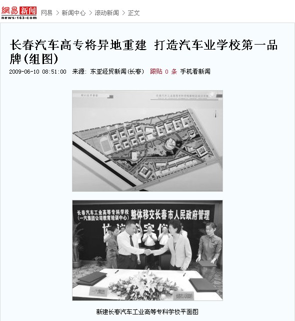军等杰出青年的学校将异地重建,新建后的学校将成为国际化、高水平的汽车业学校中的第一品牌,将建成国内最大、世界知名的汽车人才培养基地。祝业精、崔杰等长春市领导和徐建一等一汽集团领导出席了移交签字仪式。