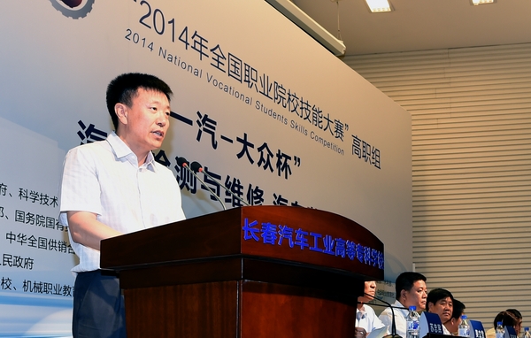 参加开幕式的领导和嘉宾有:教育部行业职业教育教学指导委员会工作办公室副主任王国川;机械职业教育发展中心主任陈晓明;吉林省政协副主席、吉林省教育厅厅长张伯军;吉林省教育厅副厅长苏忠民;长春市委常委、长春市人民政府副市长张晶莹;长春市教育局副局长安军;一汽-大众销售有限责任公司执行副总经理姜立堂;长春汽车工业高等专科学校校长李春明。开幕式由吉林省教育厅副厅长苏忠民主持,长春汽车工业高等专科学校校长李春明、一汽-大众销售有限责任公司执行副总经理姜立堂、机械职业教育发展中心主任陈晓明、长春市委常委长春市人民政府副市长张晶莹在开幕式上先后致辞。吉林省政协副主席、吉林省教育厅厅长张伯军宣布“2014年全国职业院校技能大赛吉林分赛区比赛开幕!” 陈小平同学代表参赛选手宣誓,孟祥文代表裁判员宣誓。三十多位媒体记者对大赛进行了跟踪采访。