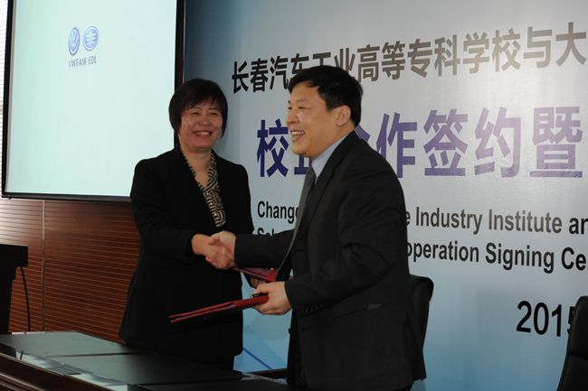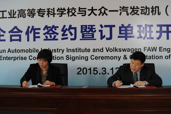 2015年3月12日下午14时,长春汽车工业高等专科学校与大众一汽发动机(大连)有限公司校企合作签约暨订单班开班仪式在培训楼401室隆重举行。大众一汽发动机(大连)有限公司前来参加仪式的有人力资源行政部总监田洁、大众中国人力资源发展和教育战略总监Hans-Peter Faber先生、大众中国各子公司商业伙伴总监陈彤、生产技术部机加成本中心高级经理宋百秋等。我校校长李春明、副校长明晓辉、校长助理胡国良、机械工程学院院长魏建军、招生就业办副主任刘凤珠、教务处副处长陆俊松以及首届订单班的24名同学和各学院师生代表二百多人共同参加了开班仪式。开班仪式由校长助理胡国良主持。