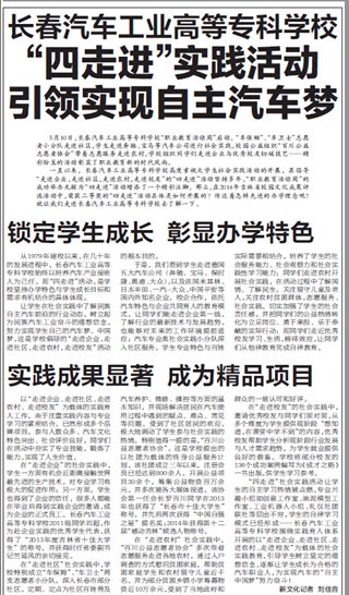 一直以来,长春汽车工业高等专科学校高度重视大学生社会实践活动的开展,其倡导“走进企业,走进社区,走进农村,走进校友”的“四走进”活动坚持多年,“职业教育活动周”的成功举办无疑为“四走进”活动增添了一个精彩注脚。那么,在2014年吉林省校园文化成果评选活动中,荣获二等奖的“四走进”活动具体是如何开展的?传达着怎样先进的办学理念呢?就让我们走进长春汽车工业高等专科学校去了解一下。