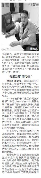 榜样: 崔朝亮2010年毕业于长春汽车工业高等专科学校电气工程学院机电一体化技术专业, 现任中国第一汽车集团股份有限公司技术中心能力保障部机械动力室维修电工。