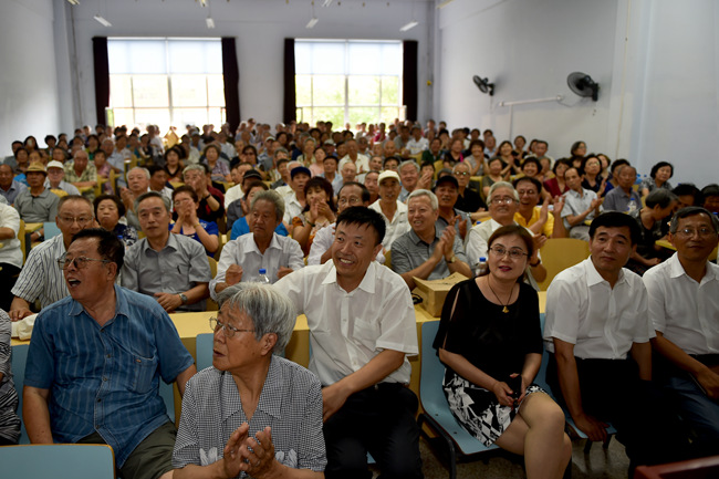 这一幕是“七﹒一”前夕,学校人事处离退休党支部组织离退休教职工开展纪念建党九十四周年庆祝活动的场景。学校各部门负责人和两百多名离退休教职工共同参加了活动。