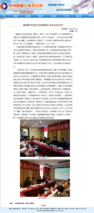 全国机械职业教育教学指导委员会(以下简称机械行指委)将新能源汽车技术专业列入首批重点观测专业,开展专业标准建设工作。为贯彻落实机械行指委工作部署,落实《中国制造2025》战略,推动职业院校新能源汽车技术专业建设与教学改革,适应新形势、新任务、新要求。高职汽车类专业教学指导委员会(以下简称汽车专指委)于2017年1月15日在北京召开了新能源汽车技术专业标准建设专题工作会议,汽车专指委部分成员单位及企业近20名专家参加了会议,会议由机械工业出版社承办。