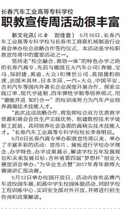 5月8日长春汽高专举办职教宣传周以来,举办了丰富多彩的活动:宣传片、展板进行学校办学理念、办学特色、办学成果展示,解读学校五年发展规划和未来发展目标;吉林省第四届“梦想杯”创业大赛宣讲会举办;“为毕业生点赞”2017年青年教师大赛演讲汇报决赛。