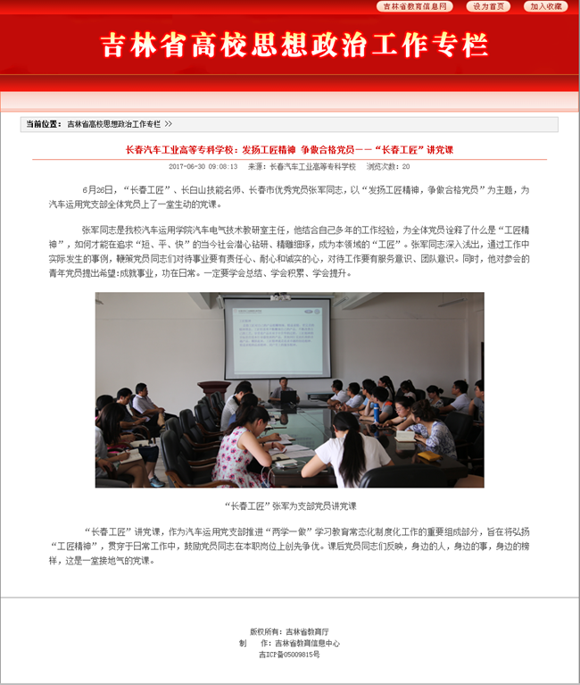 吉林省高校思想政治工作专栏——长春汽车工业高等专科学校:发扬工匠精神 争做合格党员——“长春工匠”讲党课