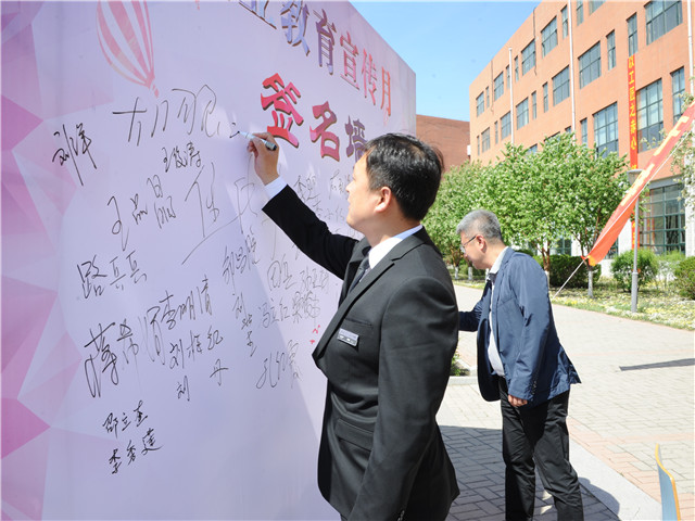 职教宣传月系列活动之邀请优秀校友与学生家长进行座谈,图为优秀校友在签名墙上签名