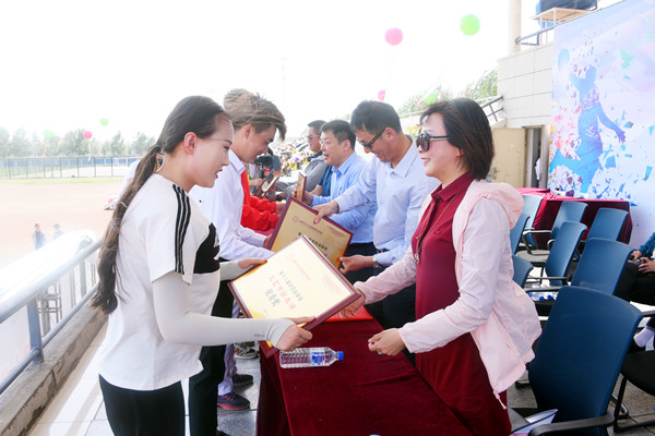 学校领导为男子团体第一名和女子团体第一名颁奖