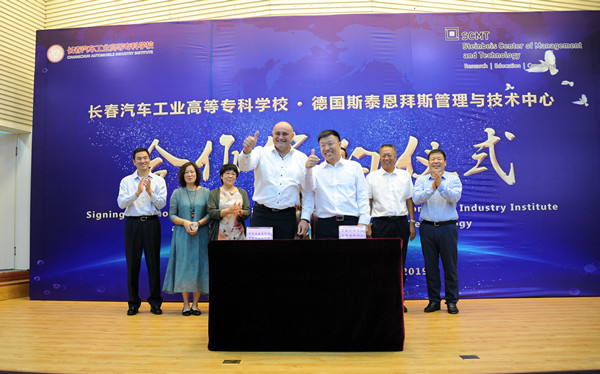 2019年9月5日上午10:30,长春汽车工业高等专科学校与德国斯泰恩拜斯管理与技术中心合作项目签约仪式,在长春汽车工业高等专科学校图书馆报告厅举行。德国斯泰恩拜斯大学创始人、斯泰恩拜斯管理与技术中心总裁、斯泰恩拜斯大学管理与技术学院院长沃尔特·贝克、德国哈尔博格学院院长王缜、北京埃尔伯格国际教育科技发展公司总经理郭晶、长春市教育局副局长张茂金、长春市教育局职成处处长张德文,我校党委书记安军、校长李春明、副校长明晓辉、副校长胡国良、副校长丁卓等学校领导参加了签约仪式。签约仪式由丁卓副校长主持。