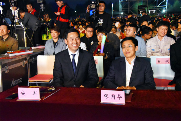 我校党委书记安军与中国一汽集团人力资源部副部长张国华在晚会现场观看演出