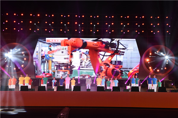 晚会第四篇章是《奋进新时代》。由我校杰出校友组成、来自一汽大众汽车有限公司的流水线合唱团曾代表汽车产业工人登上央视舞台,今天他们携手在校生共同表演了小合唱《时代号子》和《曾经的你》,用产业工人自己的声音,诉说普通工人一样可以出彩。大合唱《我爱你中国》气势磅礴、激情飞扬,生动表达了所有中华儿女对伟大祖国的衷心热爱和美好祝愿,现场6000余名观众一边挥舞着手中的红旗,一边情不自禁地齐声合唱,将本场晚会氛围推向了高潮。