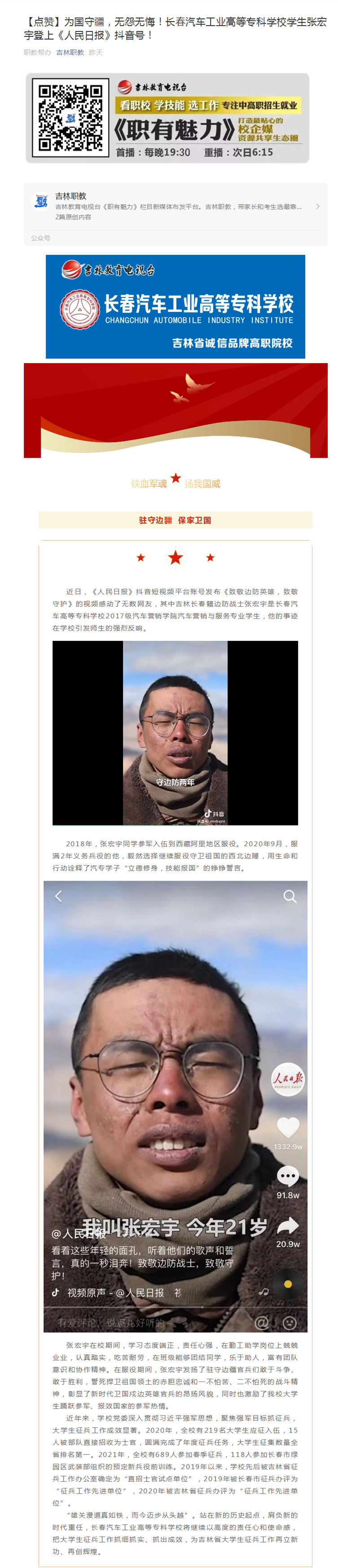 吉林职教——【点赞】为国守疆,无怨无悔!长春汽车工业高等专科学校学生张宏宇登上《人民日报》抖音号!