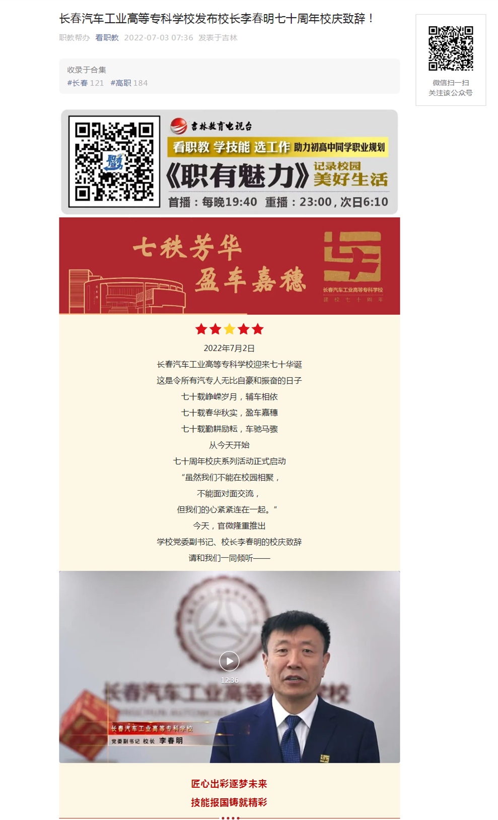 看职教——长春汽车工业高等专科学校发布校长李春明七十周年校庆致辞!