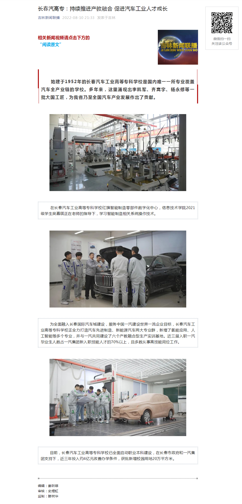 吉林新闻联播——长春汽高专:持续推进产教融合 促进汽车工业人才成长