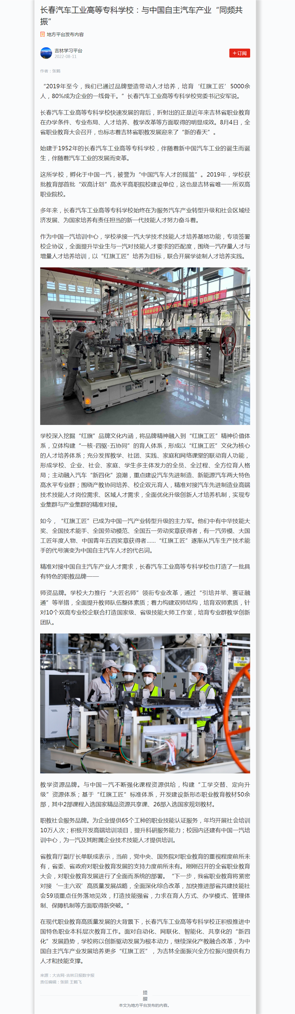 学习强国——长春汽车工业高等专科学校:与中国自主汽车产业“同频共振”