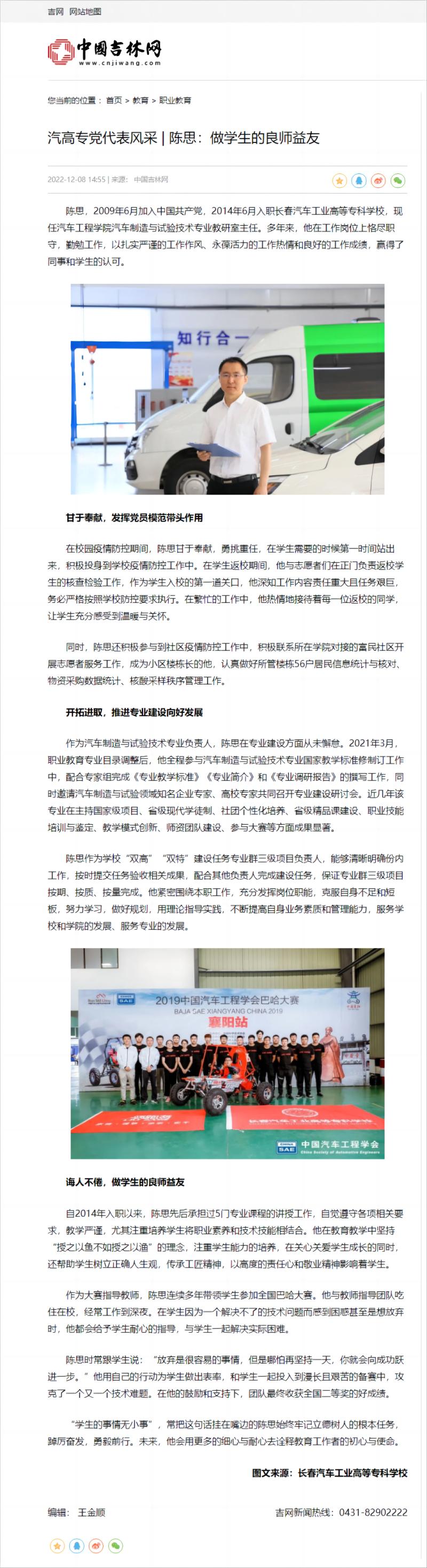 中国吉林网——汽高专党代表风采 | 陈思:做学生的良师益友
