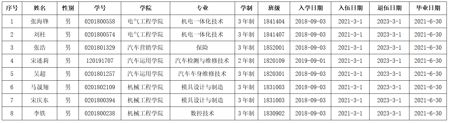 根据《关于做好2023年吉林省普通高等学校专升本教育工作的通知》(吉教学〔2023〕2号)要求,经个人申请、学院初审、学生处(团委)复审,现将2021年3月以毕业班生身份从吉林省应征入伍并于2023年3月退役后申请免试专升本且通过2023年免试专升本校级审核的学生名单予以公示。 公示期间,对公示对象有异议者,可向学生处(团委)实名反映,匿名举报不予受理。反映的情况和问题必须实事求是,我们将对反映的情况和问题进行认真调查核实,并按有关规定做出相应处理。凡反映问题不实,干扰免试专升本工作的将严肃处理。 公示时间:2023年4月12日至2023年4月19日 联系电话:0431-85751897 联系人:张老师 长春汽车工业高等专科学校 学生处(团委) 2023年4月12日