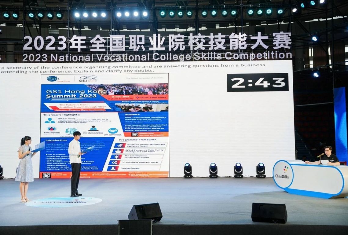 本次比赛分为“中国故事”“情景交流”“职场描述”和“职场辩论”四个环节。其中,“情景交流”和“职场辩论”环节首次采用了师生同赛的形式,师生结为竞赛共同体,一同备赛,同台参赛,在竞技中展示英语语言综合运用能力与职业风采,在教学相长中推动技能创新,充分体现了“学以致用,学用结合”的理念。
