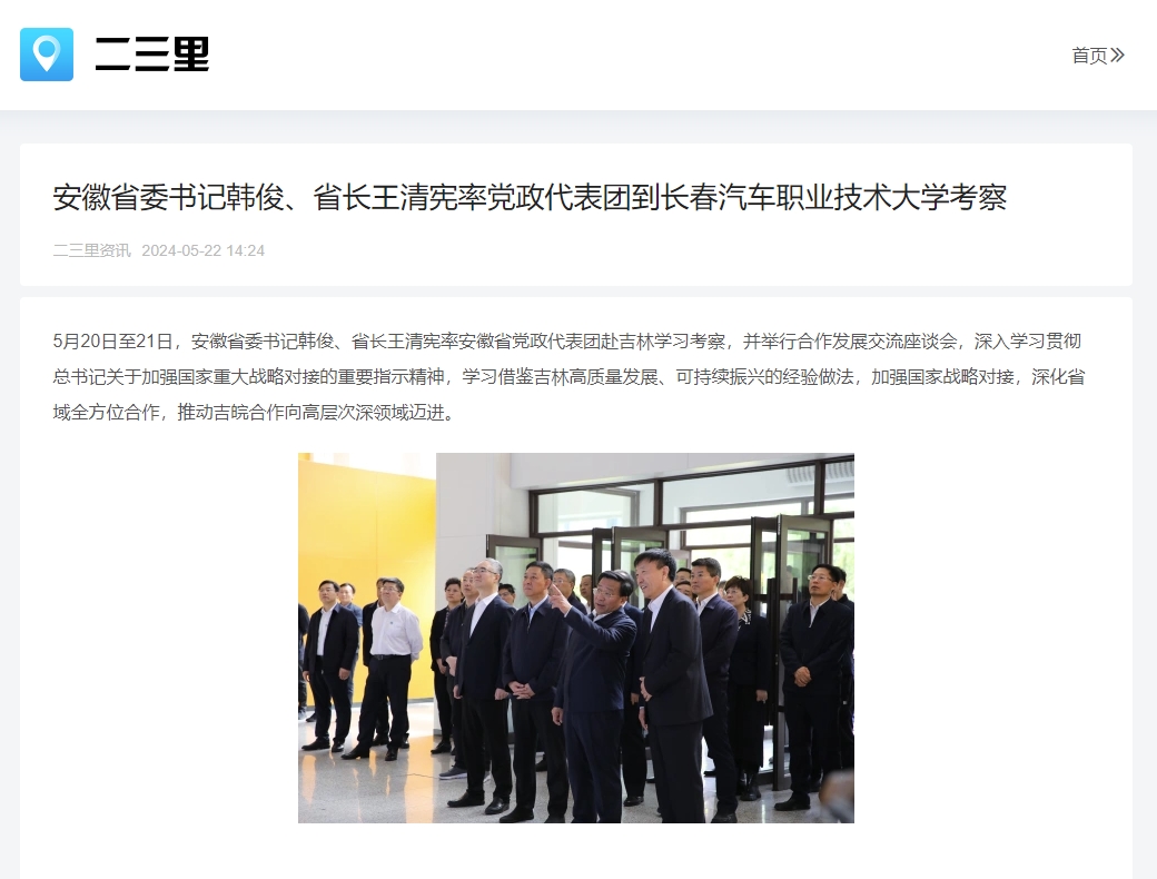 5月20日至21日,安徽省委书记韩俊、省长王清宪率安徽省党政代表团赴吉林学习考察,并举行合作发展交流座谈会,深入学习贯彻习近平总书记关于加强国家重大战略对接的重要指示精神,学习借鉴吉林高质量发展、可持续振兴的经验做法,加强国家战略对接,深化省域全方位合作,推动吉皖合作向高层次深领域迈进。