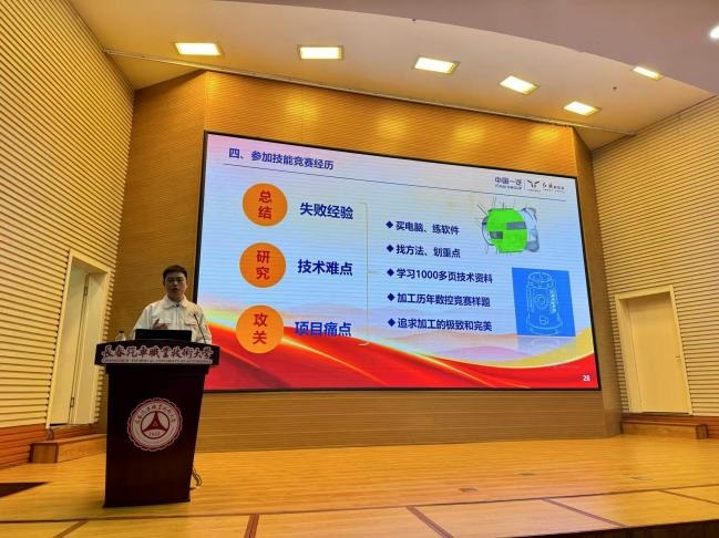 全国技术能手、吉林省特等劳动模范、中国一汽首席技能大师杨永修以“劳动铸就梦想,奋斗开创未来”为主题,讲述了自身成长经历,并分享了“红旗杯”班组大赛的相关事项和参加全国职业技能竞赛的心得体会。