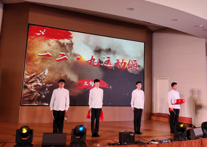 文艺汇演在情景剧《觉醒年代之青春有我》中拉开了序幕。同学们通过生动的表演,再现了那段激情燃烧的岁月,展现了青年学子在国家危难之际挺身而出的英勇形象。三句半《“一二·九”运动颂》颂扬了“一二·九”运动中学生们不屈不挠的斗争精神。朗诵《不朽的丰碑》深情回顾了“一二·九”运动的伟大历程,表达了对革命先烈的无限敬仰和深切怀念。街舞《大中国》以欢快的节奏和动感的舞姿,展现了当代大学生的活力与风采。乐队表演《新长征路上的摇滚》则将现场气氛推向了高潮,激昂的旋律和深情的演唱,让人仿佛置身于那个充满革命激情的年代。