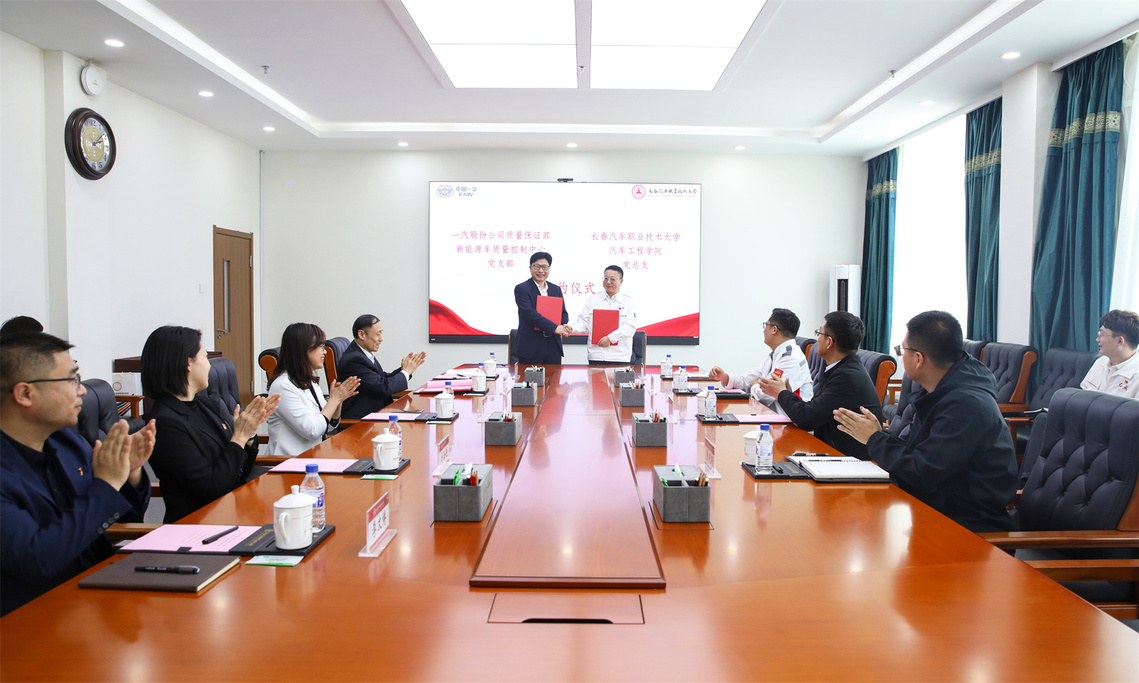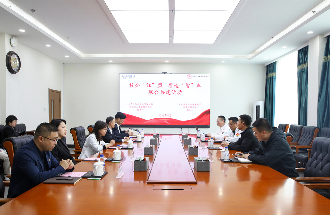 5月13日,汽车工程学院党总支与一汽股份公司质量保证部新能源车质量控制中心党支部在学校508会议室举行以“校企‘红’盟、质造‘智’车”为主题的党建联建活动,旨在通过党建引领深化产教融合,为智能网联汽车人才培养和技术创新注入新动能。一汽股份公司质量保证部总经理助理王超、新能源车质量控制中心高级主任王兵、节能车质量控制中心高级主任刘德华、分析中心高级主任董晓明,学校党委副书记赵娜、副校长张勇忠,汽车工程学院党总支书记、院长李东兵,教学工作负责人李文博,党总支副书记马海艳共同出席此次活动。