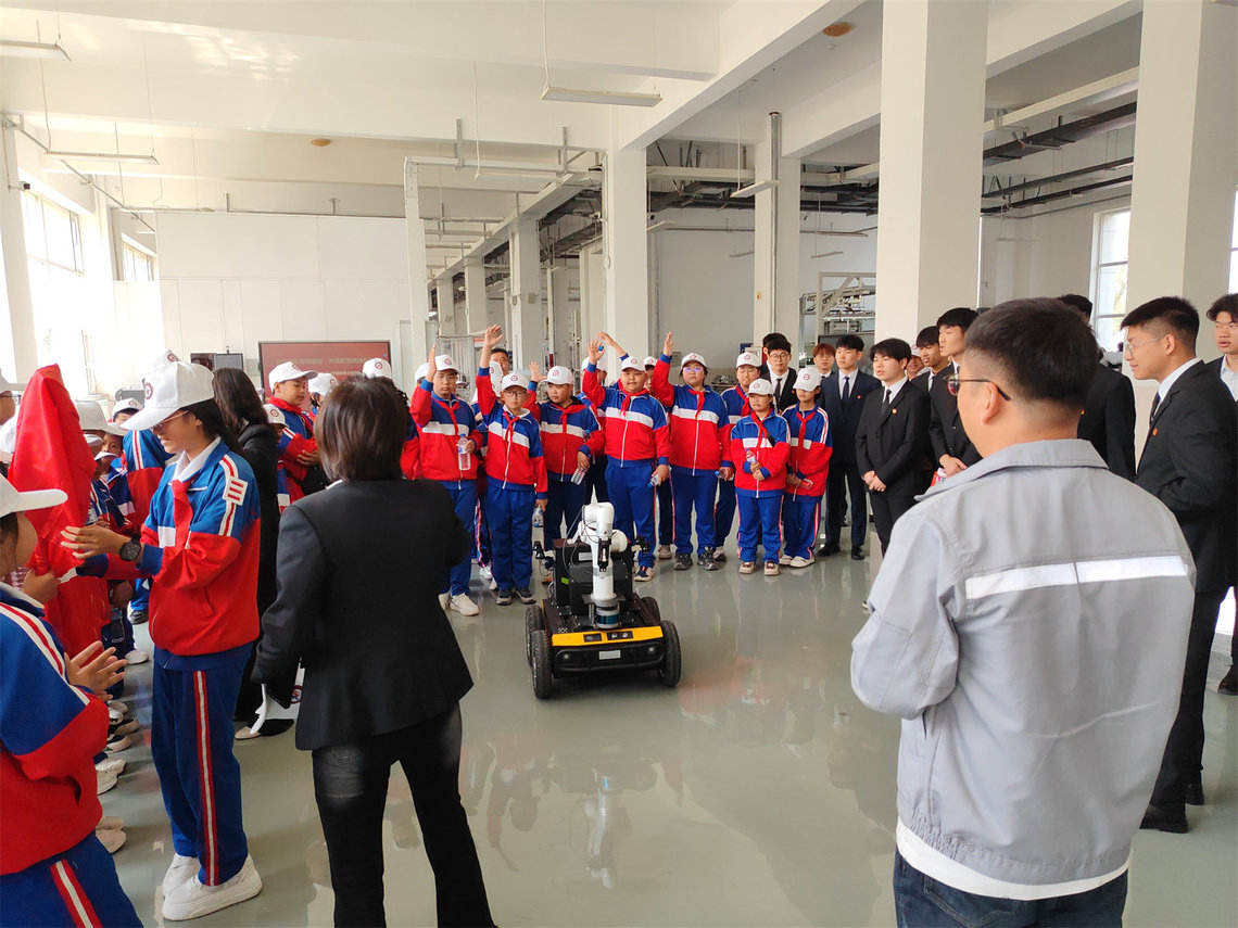 师生们随后参观了电气工程学院工业机器人基地与智能制造协同创新中心。电气工程学院院长梁法辉介绍了学院在汽车职业教育领域的办学特色与成果,在现代化工厂模拟场景中,高速运转的机械臂、精准协作的智能生产线令孩子们目不暇接。梁法辉表示,此次研学让课本知识“活”了起来,也让孩子们对工业4.0有了具象认知。 韩昊宏老师向小朋友们介绍了工业机器人的工作原理并引导孩子们现场演示;柏淑军老师通过机器人的动态展示,引导同学们思考科技如何服务于社会生产与生活,激发了大家对“工程师梦想” 的向往。