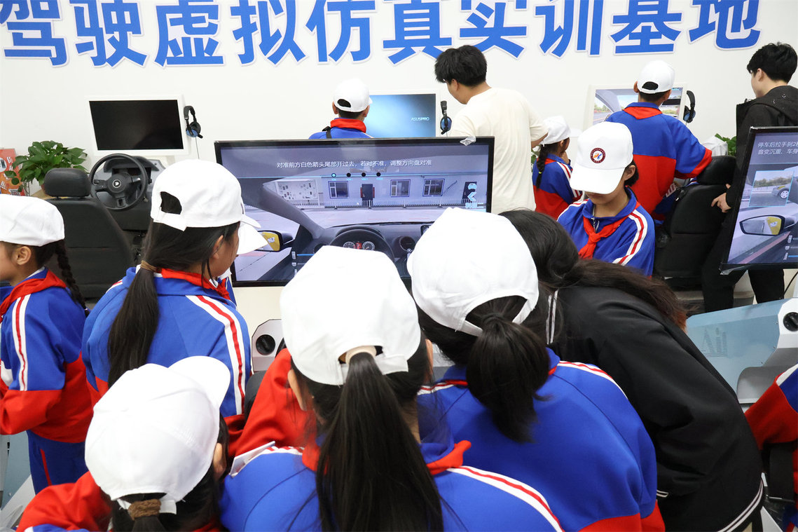下午,师生们走进创新创业中心,开启创意之旅。在古车文化展区,同学们驻足观看历代车模演变,感受汽车文化的深厚底蕴;在智能驾驶体验区,孩子们借助虚拟现实设备,沉浸式感受驾考科目二场景,逼真的模拟体验让大家兴奋雀跃。最令人期待的当数手工创作环节,在单吉老师的指导下,同学们分组协作制作书桌,并在桌面进行个性化设计。“希望少年,与旗相伴”“我的汽车梦”等稚嫩而充满力量的文字跃然桌上,每一笔勾勒都承载着对未来的憧憬。