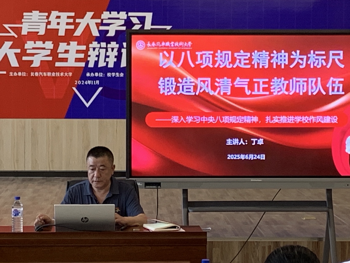丁卓深刻阐述深入贯彻落实中央八项规定精神、加强作风建设的重要意义。他指出,全体党员要将保持党的先进性和纯洁性作为使命,牢牢把握立德树人这一根本任务,凝心聚力为学校事业发展注入强劲动力。在讲述过程中,丁卓结合学校实际,详细介绍了学校在贯彻落实中央八项规定精神方面所取得的积极进展,分享了工作推进中的宝贵经验。同时,他秉持实事求是的态度,直面各支部在作风建设中存在的问题,精准指出具体的整改方向与切实可行的举措。他强调,全体党员教师务必时刻以八项规定精神为“标尺”丈量自身行为,以其为“镜鉴”审视思想动态,不断筑牢廉洁自律的思想根基,奋力推动学校作风建设迈向新高度。