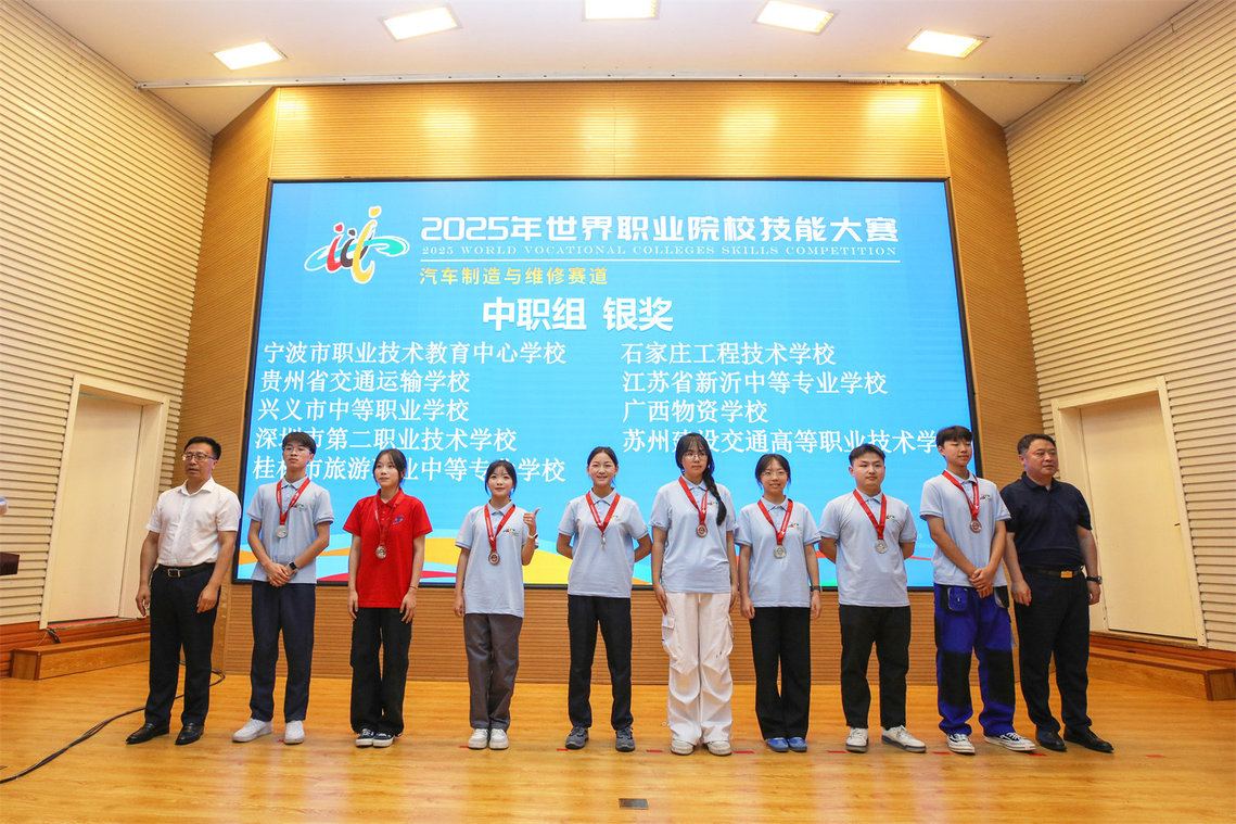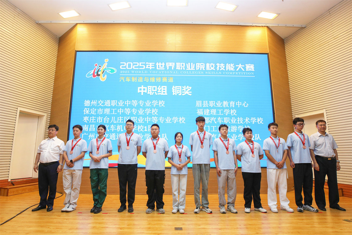 全国汽车职业教育教学指导委员会秘书长徐念峰、吉林省教育厅副厅长刘学军为中职组金奖获奖队伍颁发奖牌。