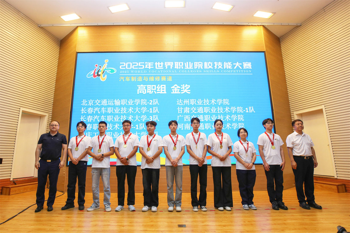 全国汽车职业教育教学指导委员会秘书长徐念峰,吉林省教育厅副厅长刘学军为高职组金奖获奖队伍颁发奖牌。