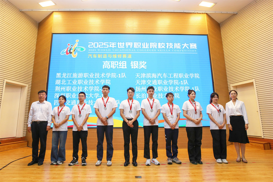 长春市教育局副局长李亚君、吉林交通职业技术学院党委书记于繁华为中职组银奖获奖队伍颁发奖牌。