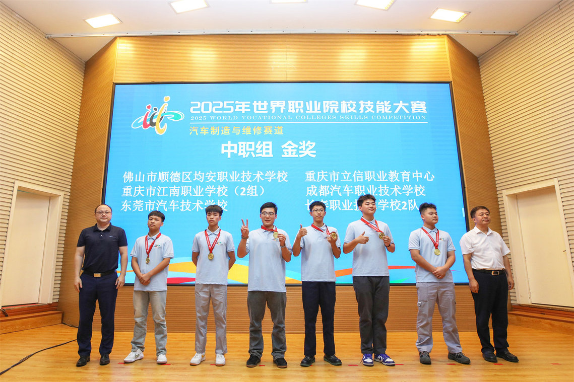 全国汽车职业教育教学指导委员会秘书长徐念峰、吉林省教育厅副厅长刘学军为中职组金奖获奖队伍颁发奖牌。