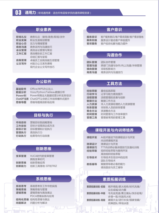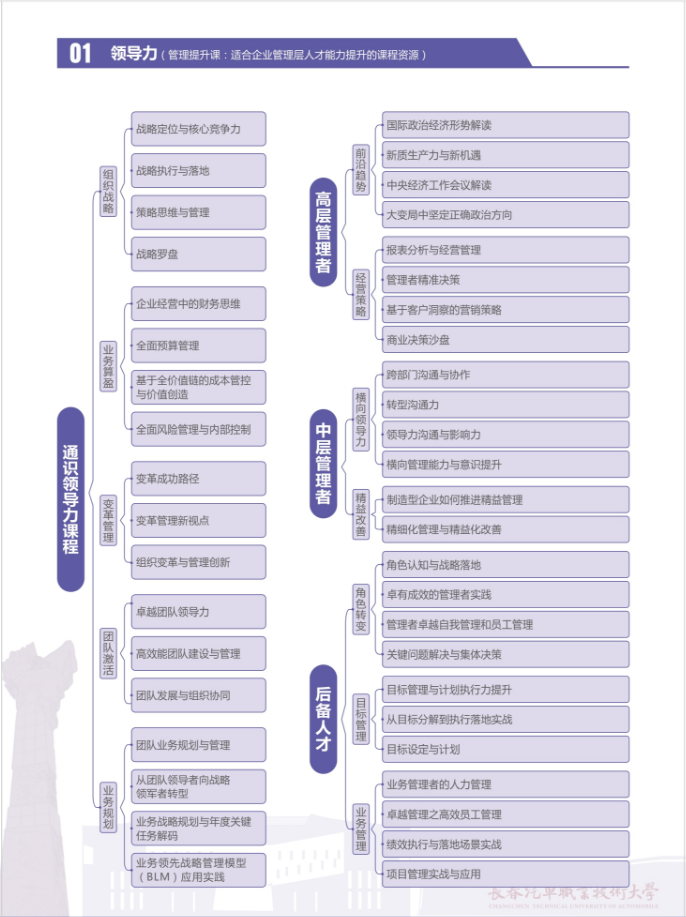 管理类培训作为培训与继续教育学院社会化服务的重要窗口之一,一直秉承以客户需求为导向,以提供客户满意的培训服务为宗旨。在管理力方面,我校致力于建立涵盖企业管理培训发展与人才培养“一体化”全价值链发展体系,通过管理力咨询及培养、胜任力素质模型构建、测评盘点等方面的课程方案设计,建立以培训促提升、以学习促发展的常态化机制,使企业管理人才队伍在企业转型升级中发挥更大作用。我校先后组织承办中国一汽蓄航计划培训、中国一汽战略研讨会前沿趋势专题培训等里程碑式的人才能力提升培训项目,为助力汽车产业发展提供了强有力的智力支持与服务保障。