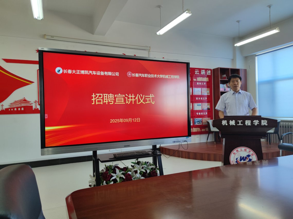 为深入推进职业本科教育高质量发展,深化产教融合、校企协同育人,9月12日下午,我校机械工程学院与长春大正博凯汽车设备有限公司校企合作暨本科专业改革创新实验班开班仪式顺利举行。长春大正博凯汽车设备有限公司总经理刘广岩、培训中心主任张鹤,我校机械工程学院院长潘孝春、教学负责人马旭东等出席仪式,2025级职业本科机械设计制造及自动化专业二年制全体新生参加仪式。仪式上,刘广岩介绍了公司的基本情况、主营业务、岗位需求等,并对汽车产业工艺装备研发领域技术发展进行了详细讲解,就学生咨询的相关问题进行了细致解答。他表示将以此次校企合作为契机,协同校方在职业本科专业人才培养、专业建设、资源开发、师资队伍建设方面共享企业的优质资源,更好助力学校职业本科建设。潘孝春表示,此次校企合作是提升专业建设水平,提高人才培养质量,强化学生高端岗位就业及职业适应性的有力举措,希望双方通过进一步合作,在人才培养、基地建设、科学研究、技术服务等方面取得更多标志性成果。此次开班仪式既是校企双方携手共育职业本科层次技术技能人才的重要起点,也是新生入学教育中专业认知的关键一课。下一步,校企双方将进一步建立深度协同机制,持续优化人